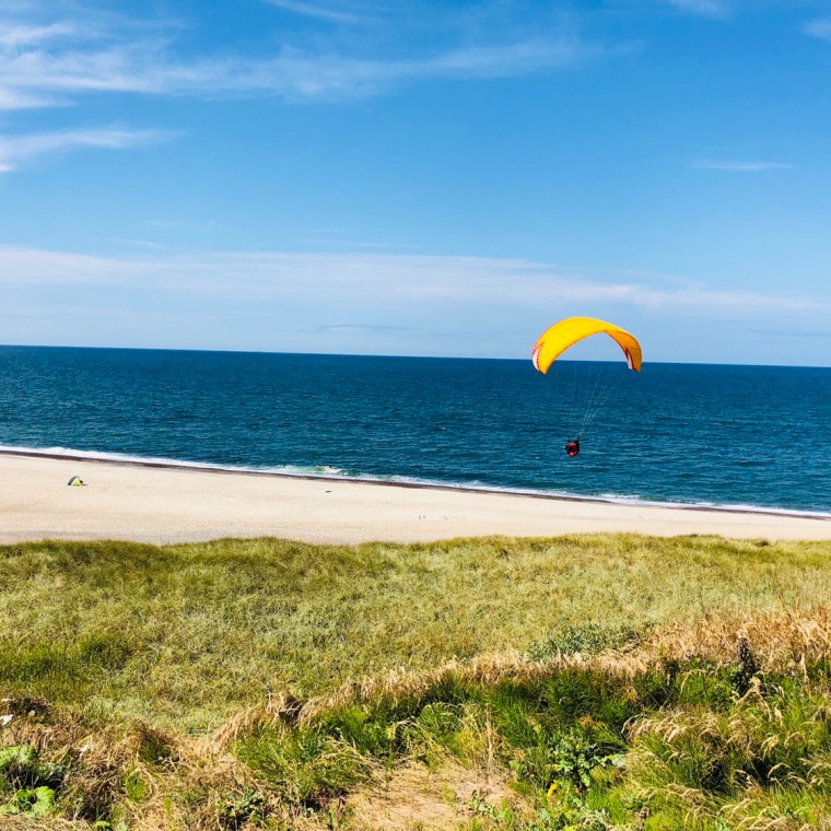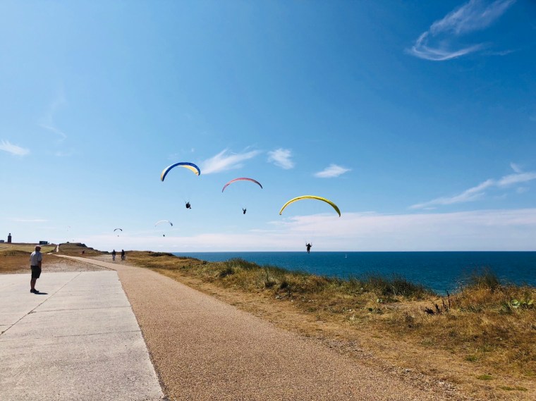 Oben führte ein sehr sandiger weg dann weiter. Musste man trotzdem aufpassen dass man nicht stecken bleibt oder wegrutscht. Irgendwann wurde es wieder zu Schotter und dann zu einem Radweg, der zum Leuchtturm führte. An der Küste waren bestimmt 15 Paraglyder (kein Plan wie man das schreibt). Sah toll aus. Nur fliegen ist schöner! Ähm ich mein biken 😉 scheint hier irgendwie in zu sein. Hat sich bis zu meinem Ziel durchgezogen – überall Flugschirme!