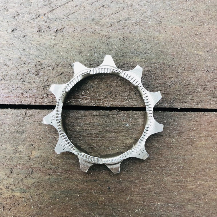 Naja,… wieder zurück in köln bin ich direkt in die Werkstatt gerollt, hab mich 2,5 Stunden mit meinem Fahrradmechaniker des Vertrauens unterhalten und dann geduldig gewartet bis ich es wieder abholen konnte. Zuerst sah das Ritzel noch vollkommen in Ordnung aus. Aber nachdem alles nix half hat er es ausgetauscht. Warum ich dieses Bike jetzt noch mehr liebe? Man kann meine 2 meist gefahrenen Ritzel einzeln austauschen! Dä! Bei meinen anderen bikes war immer direkt die ganze Kassette tauschen angesagt! Das geht natürlich ins Geld. Ich hab mir das kleine Scheisserle (gereinigt) mitgeben lassen. Ganz besonderes Andenken an die Tour 2019! Was könnt ich denn daraus machen!? Jemand ne Idee?!